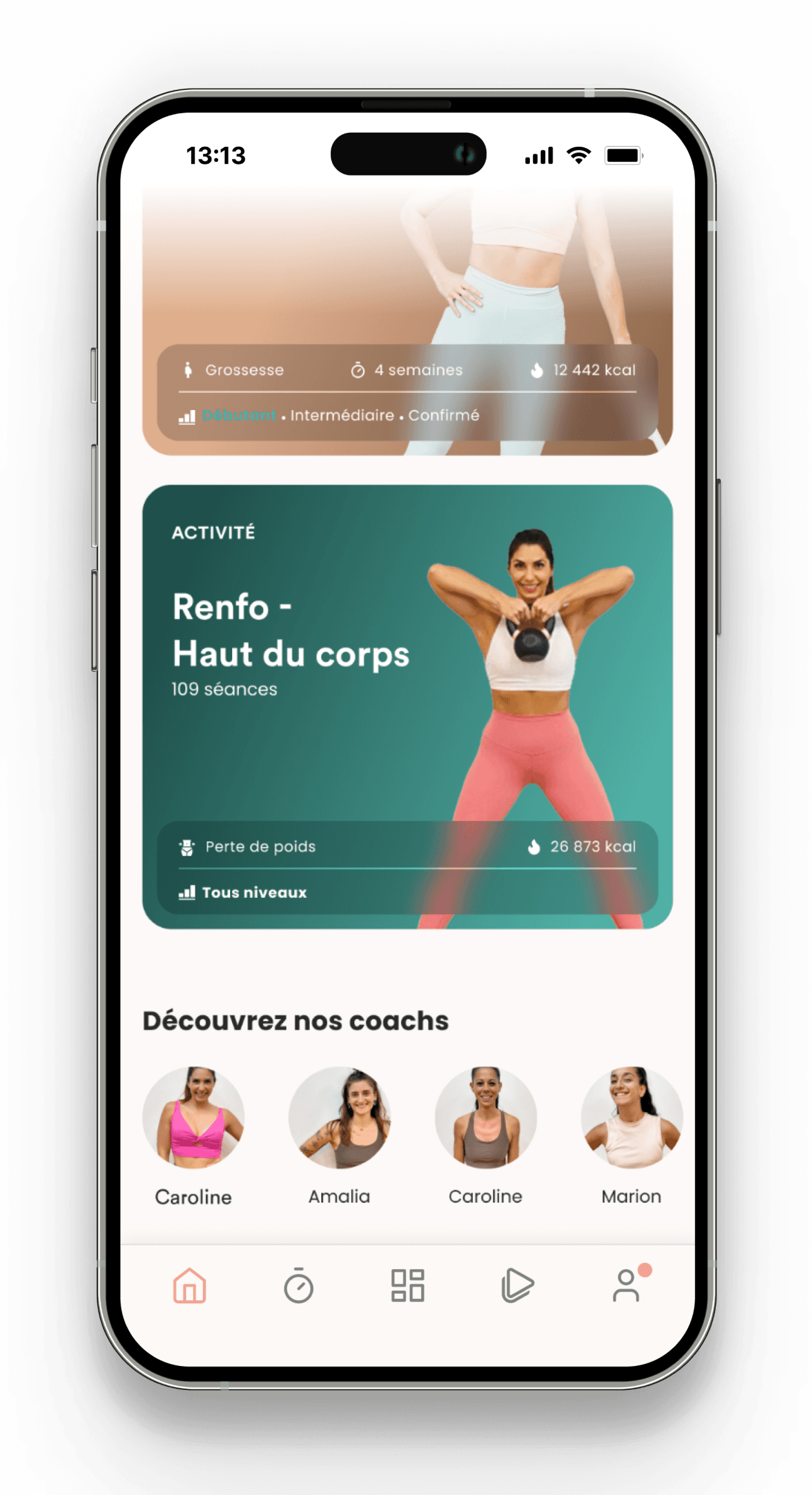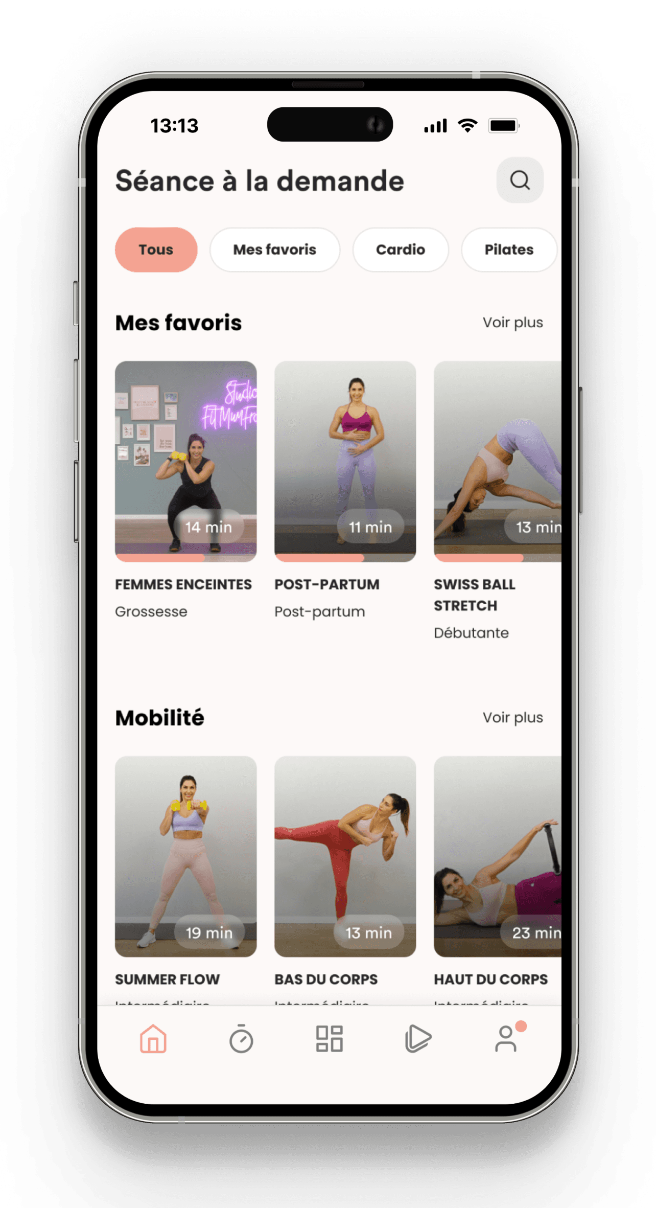 + de 240 séances pour progresser du niveau post-partum au niveau confirmé grâce à des cours de cardio, renfo, pilates postnatal, yoga postnatal, stretching et mobilité.