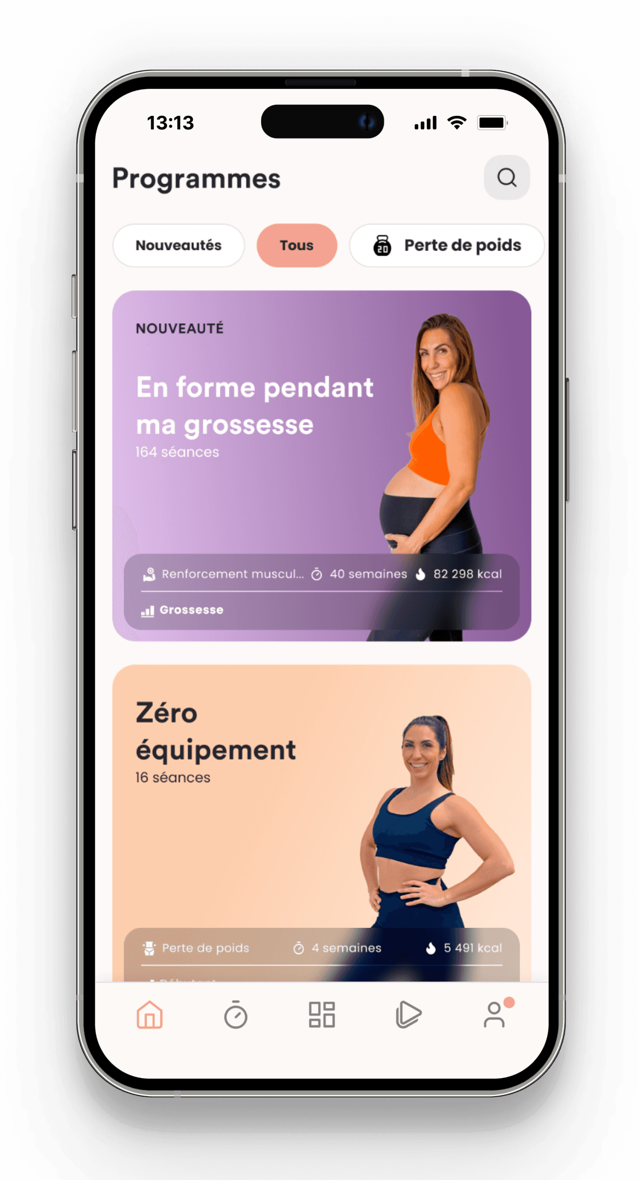 + de 160 séances de cardio, renforcement musculaire, pilates prénatal, yoga prénatal, stretching, mobilité pour garder la forme, préparer votre corps à l’accouchement et votre future vie de maman.