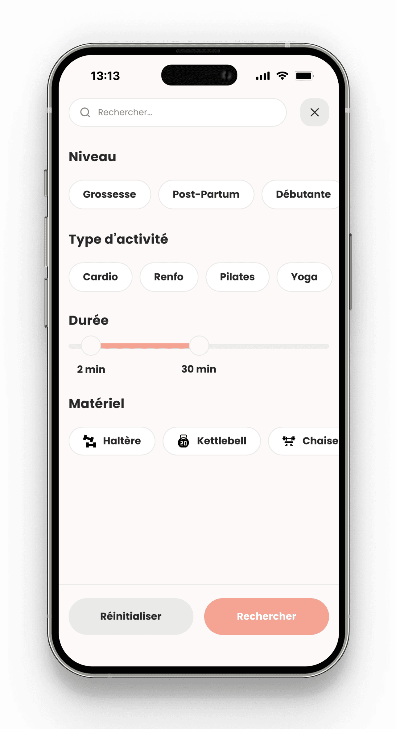 Choisissez votre niveau sportif, votre activité, la durée et le matériel à disposition.
