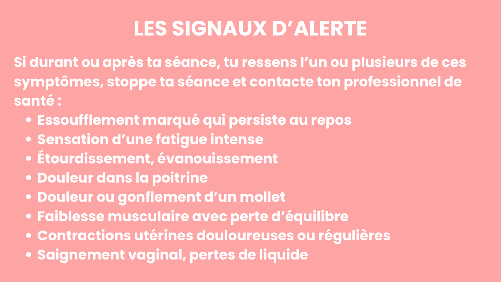 Et bien sûr, même si tu bouges en douceur, il est important de rester à l’écoute de ton corps et de repérer certains signes qui doivent t’alerter.