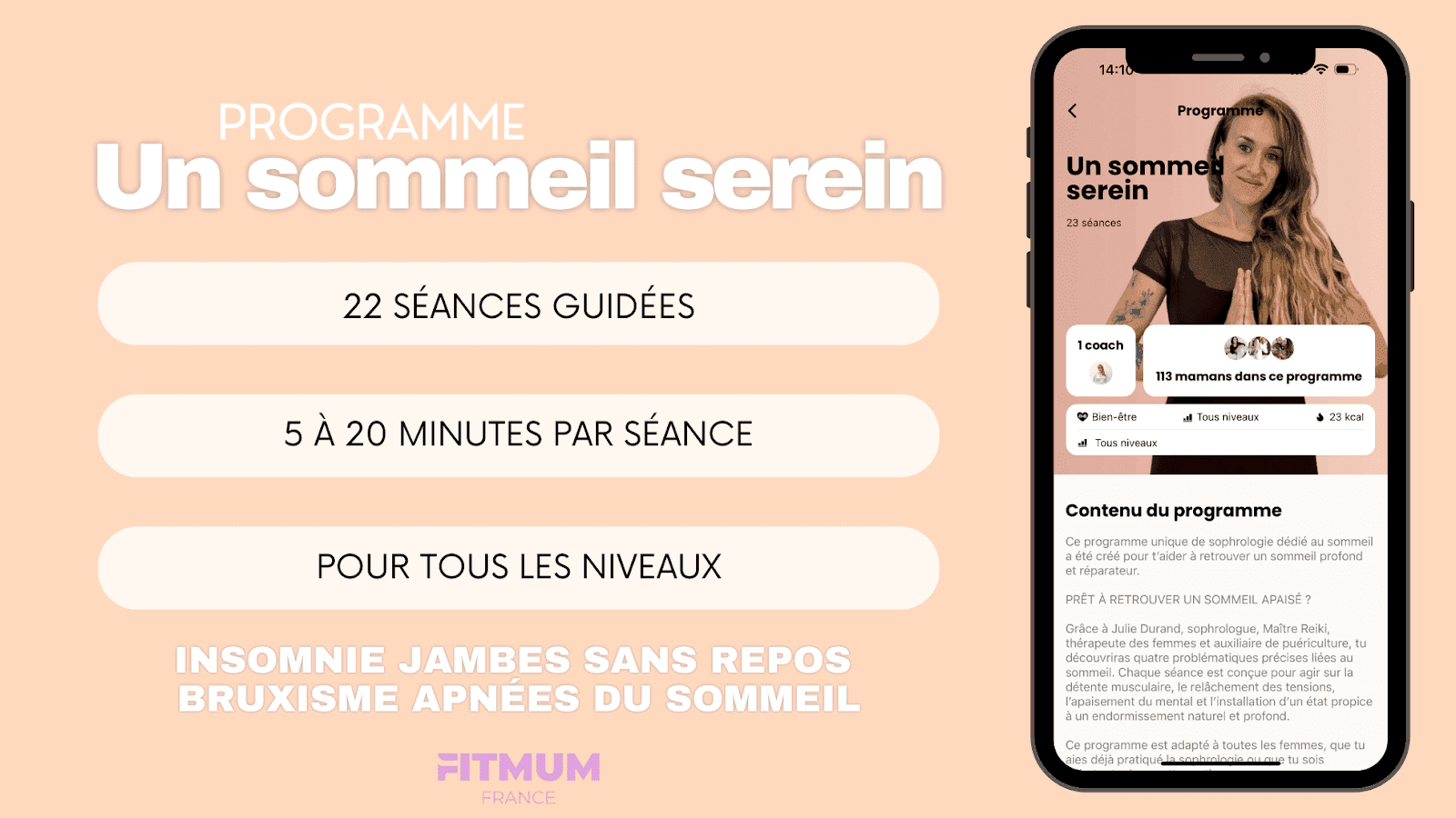 Le programme de sophrologie Un sommeil serein disponible sur l’application de fitness FitMum France, est conçu pour t’aider à retrouver un sommeil profond et réparateur.