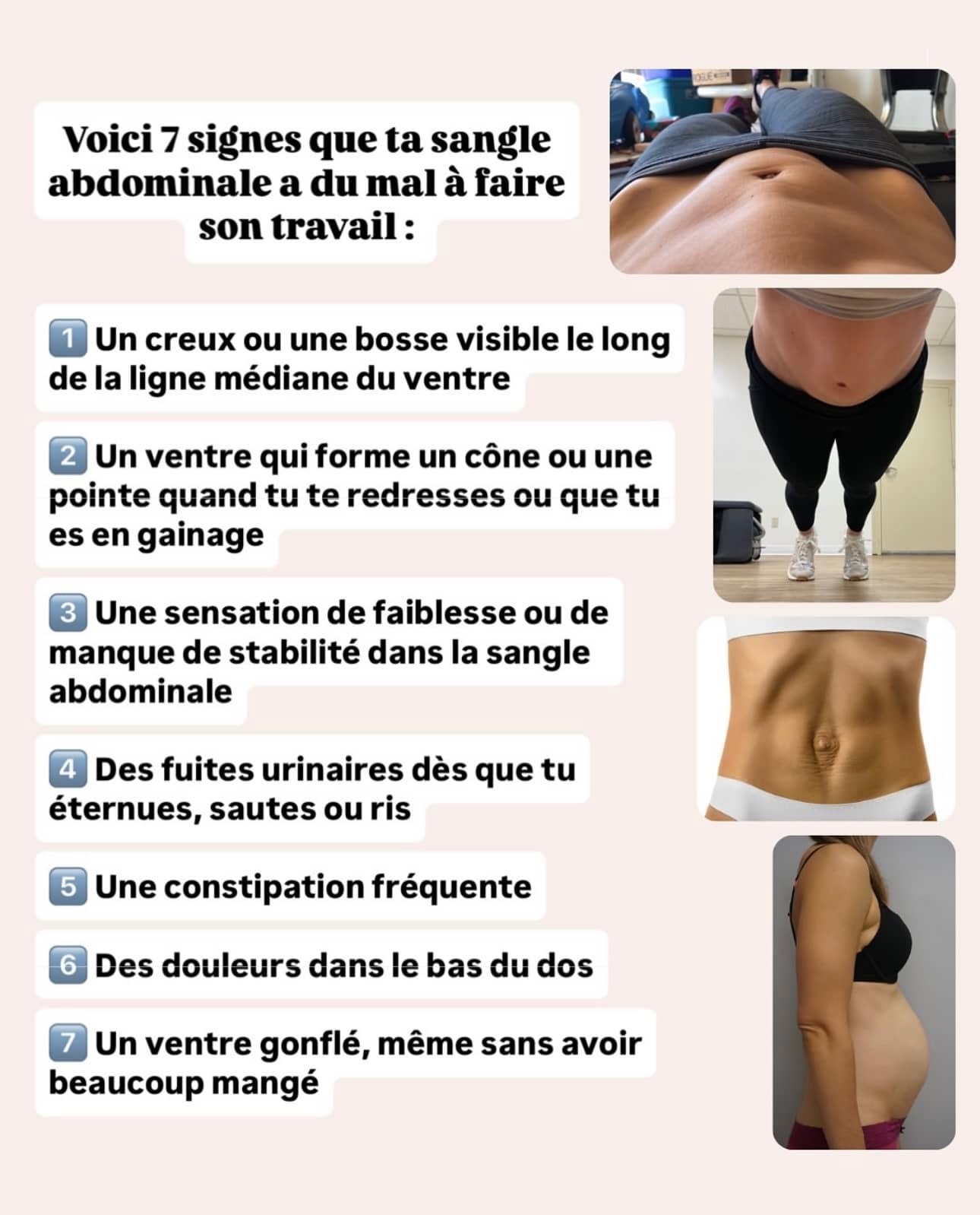 Aggravation d’un diastasis abdominal : pratiquer des exercices inadaptés peut accentuer l’écartement des abdominaux, provoquant des douleurs, un ventre qui reste relâché ou gonflé, ainsi qu’une perte de tonicité de la sangle abdominale.